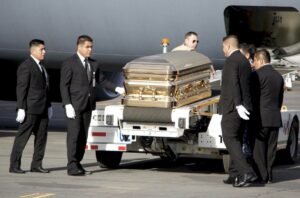 Una carroza fúnebre espera los restos del «Príncipe de la Canción» en el hangar del extinto Estado Mayor Presidencial que trasladará los restos a Bellas Artes, la Basílica de Guadalupe y el Panteón Francés.